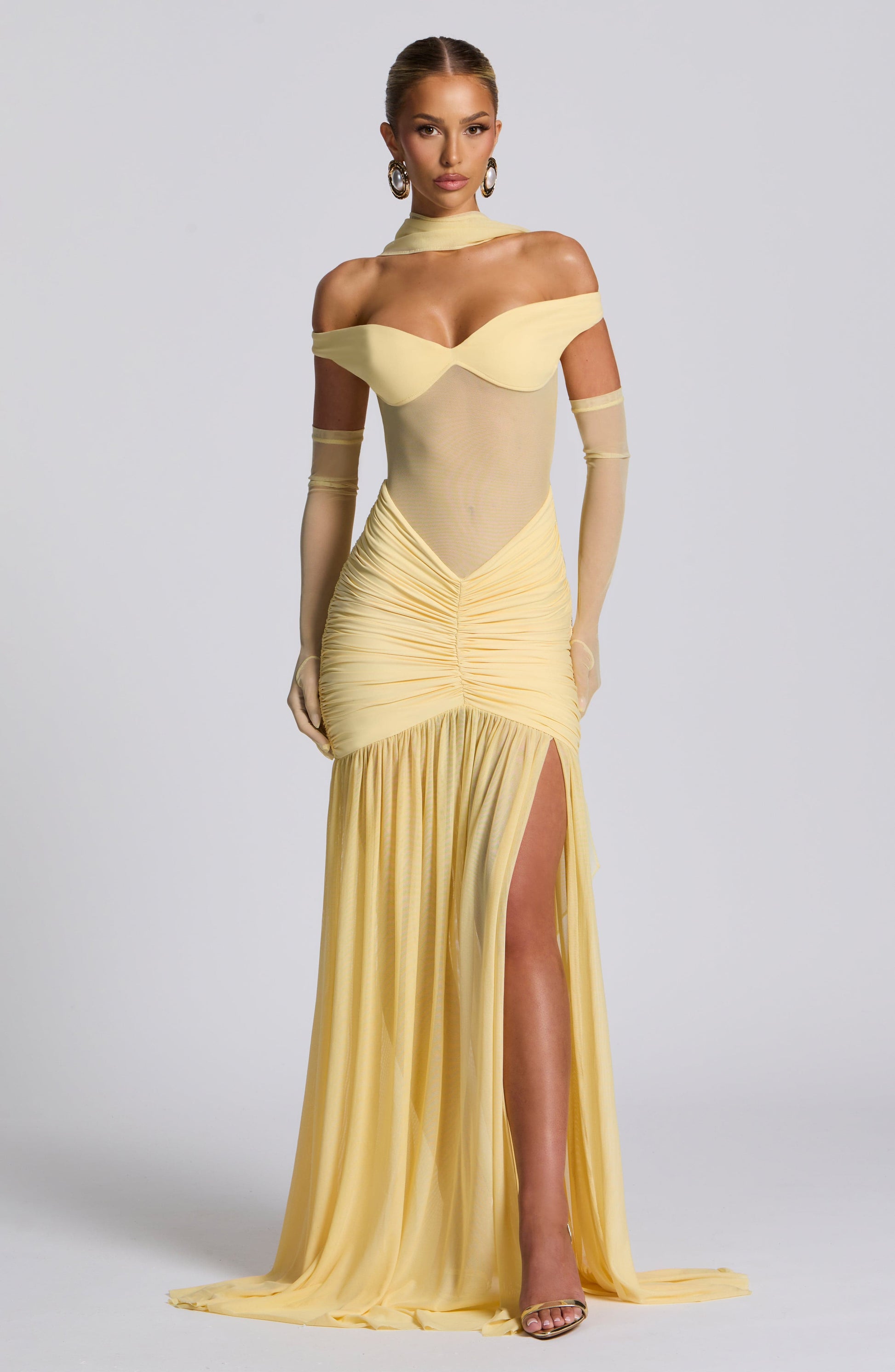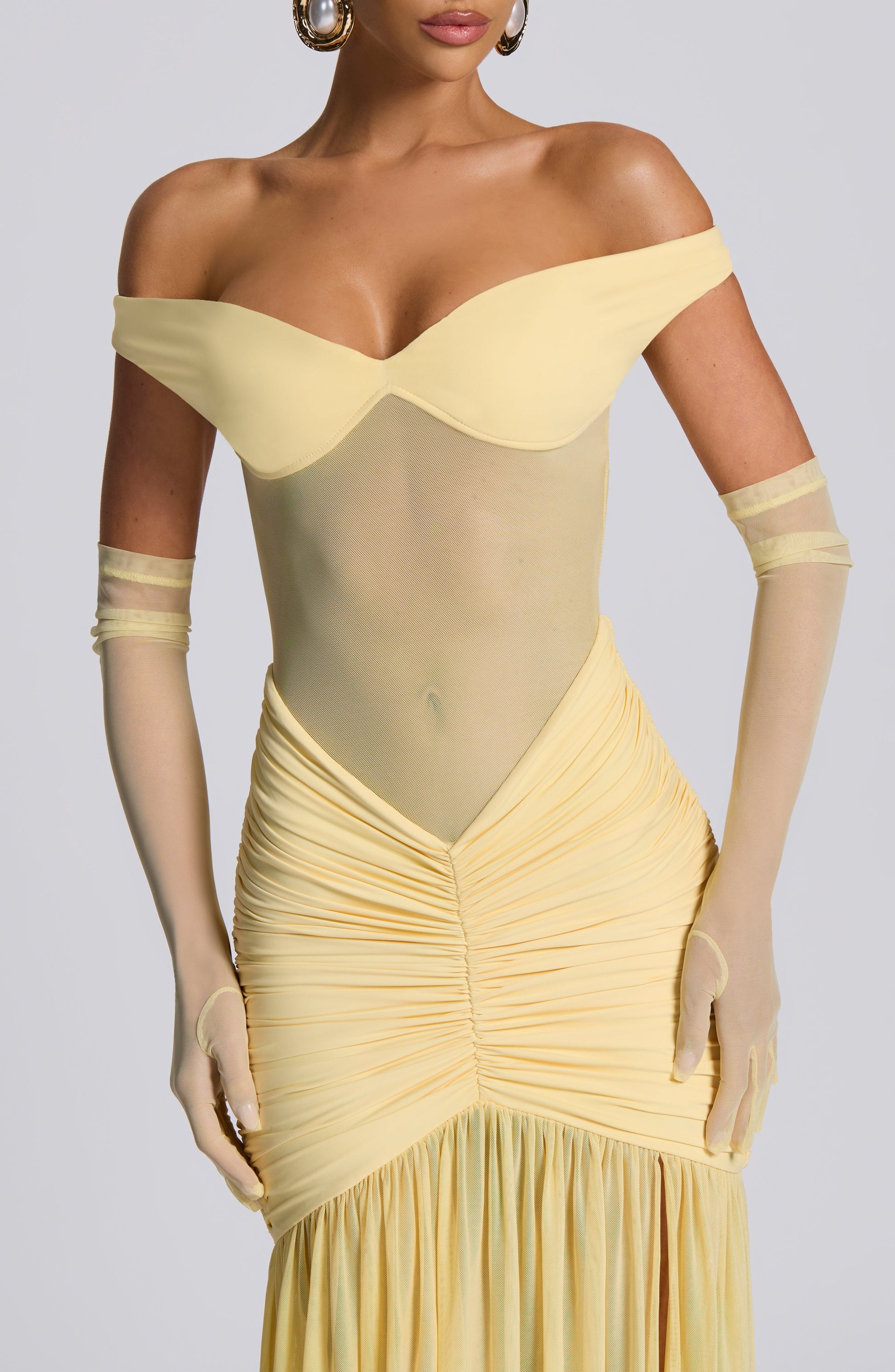 The Eli Gloves in Lemon offer sophisticated allure with their above-elbow silhouette. Crafted from soft stretch mesh and elegantly unlined, these statement accessories add a refined touch to any ensemble.