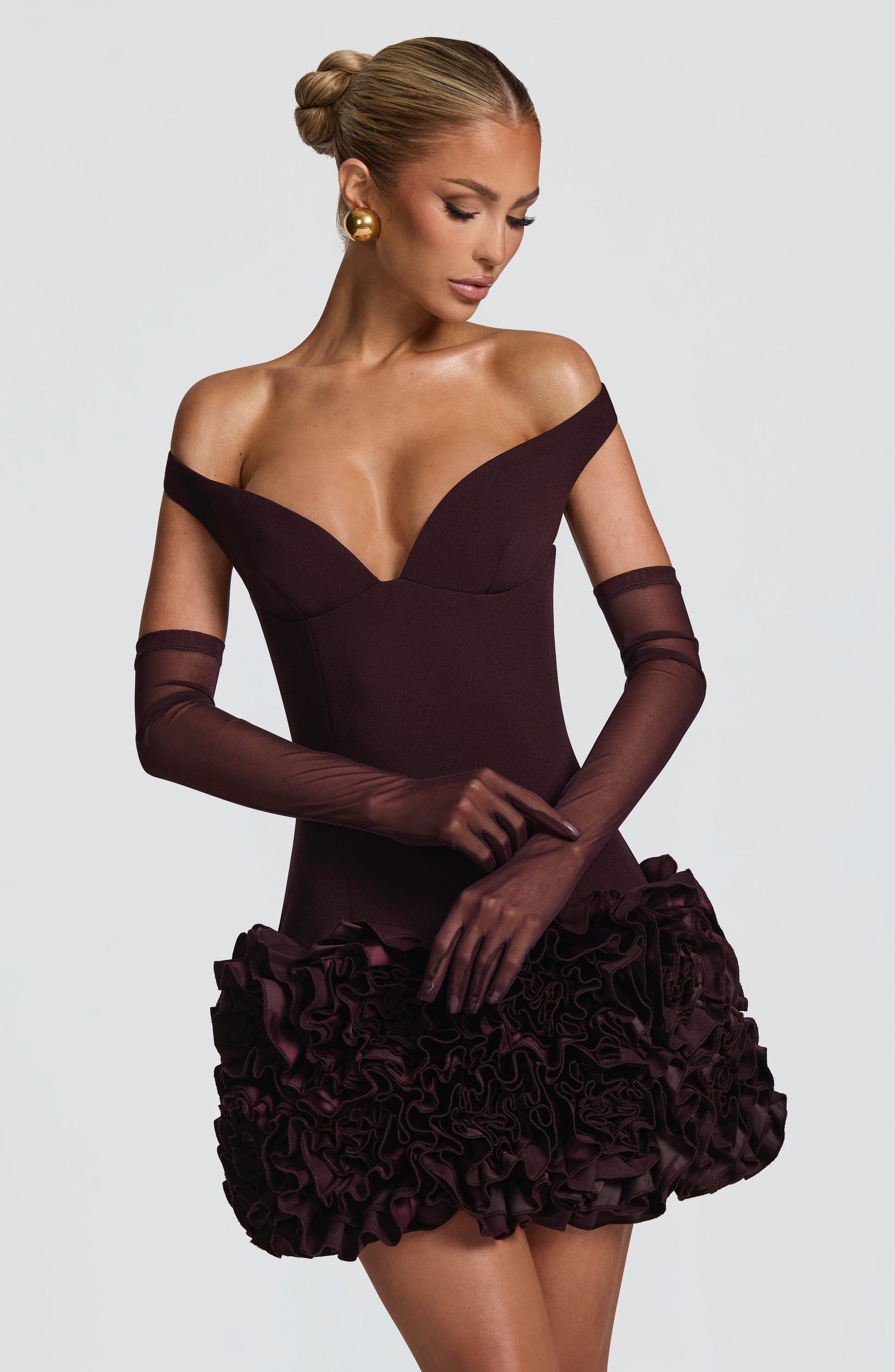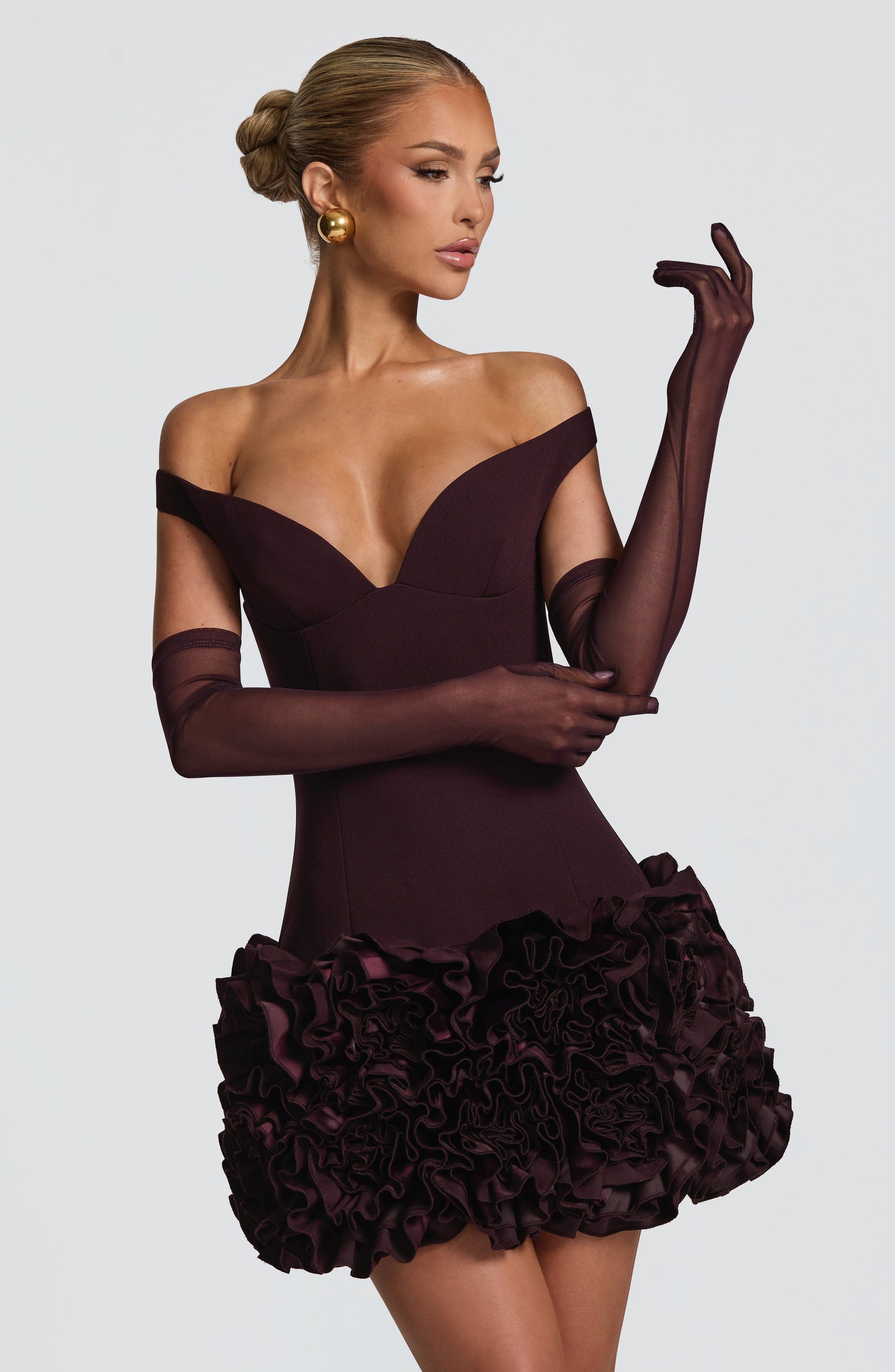 Elevate your ensemble with the Eli Gloves in a rich plum hue. These above-elbow length gloves feature a delicate light stretch mesh that contours gracefully to your arm, offering an elegant silhouette without lining for a refined, breathable feel.