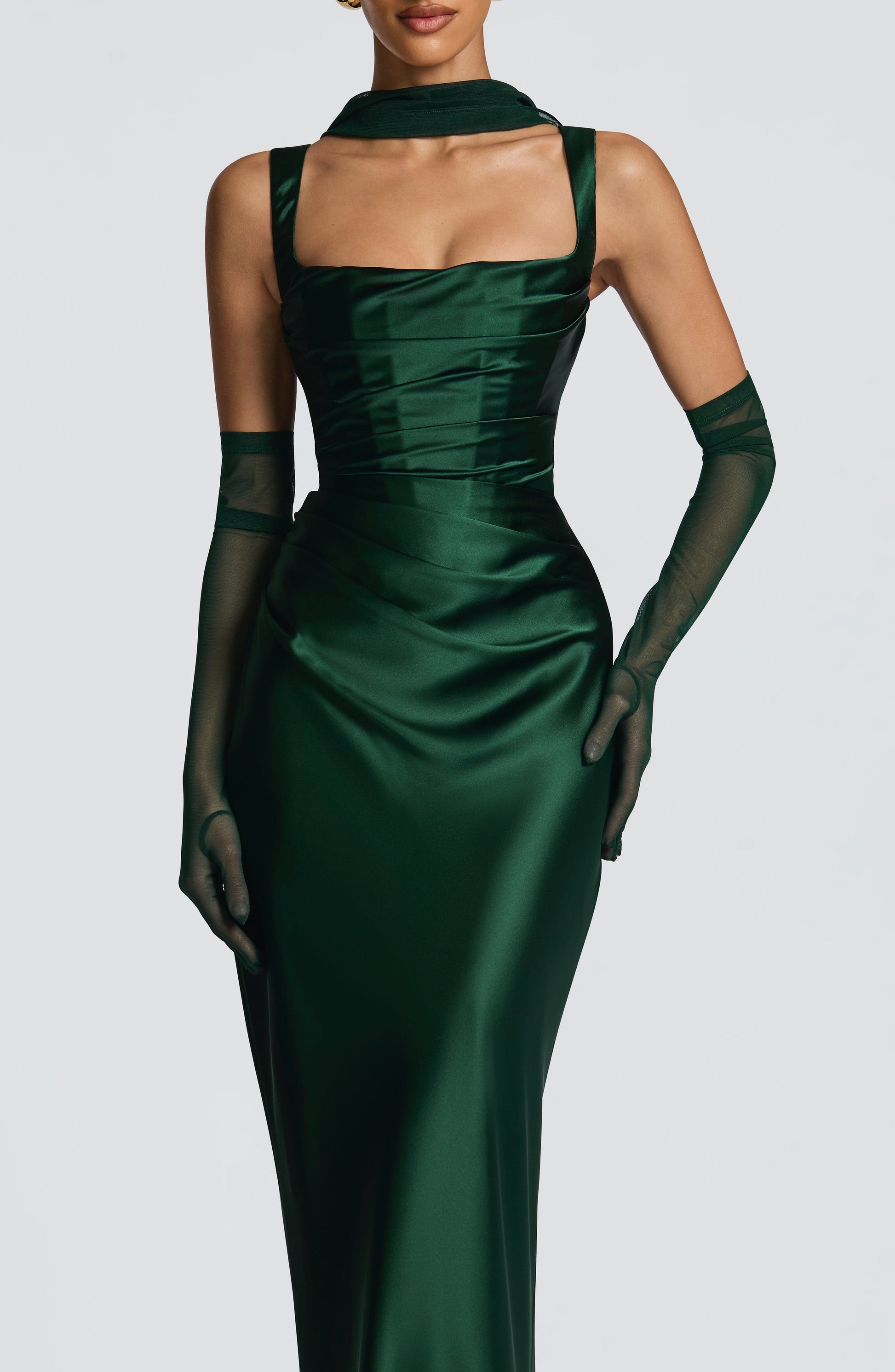 The Calanthe Maxi Dress in Emerald features a luxurious satin finish with a square neckline adorned by elegant pleated drape details. Asymmetric pleats on the bodice and tapered straps create a refined silhouette, while the lace-up back adds a delicate, sophisticated touch.