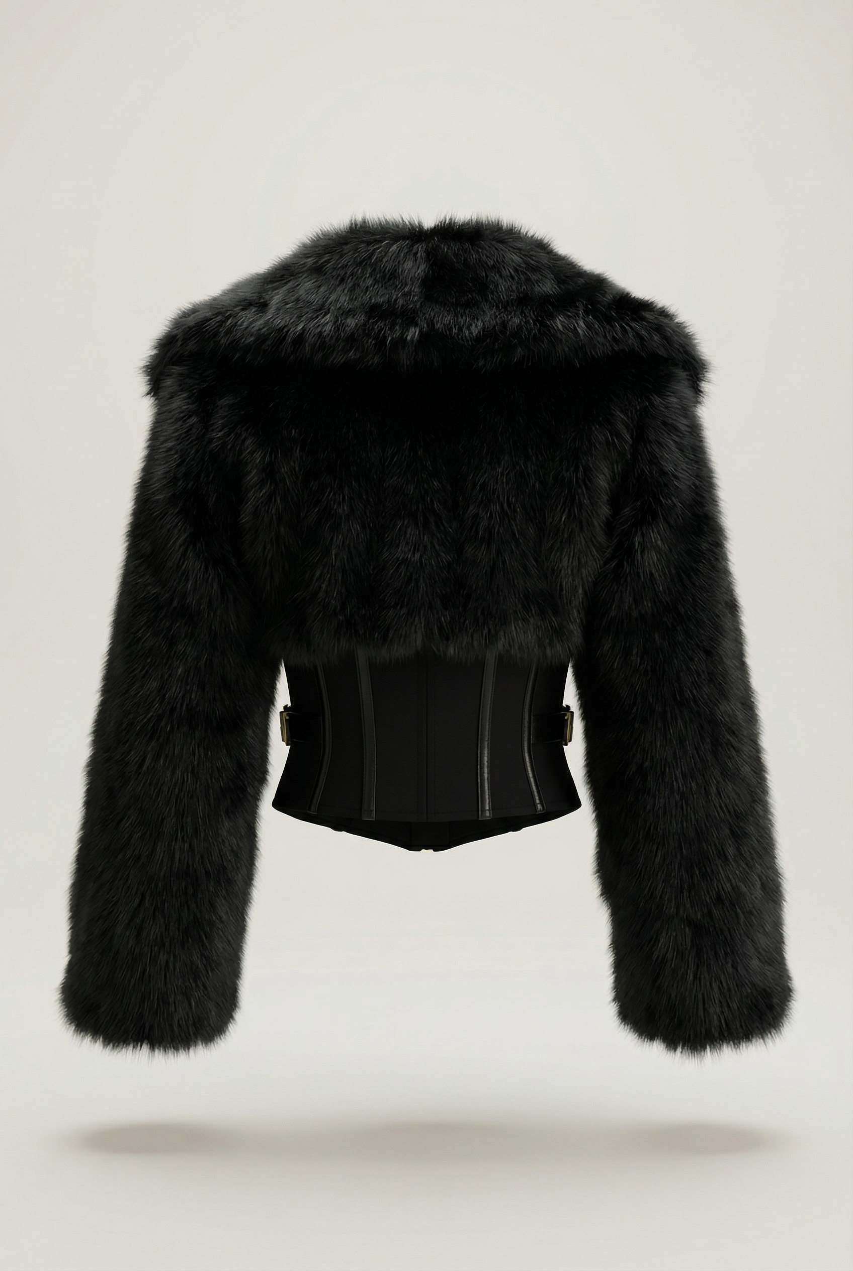 The Élisabeth coat delivers an instant “Ladies in Paris” vibe. A short jacket designed as a statement piece: a wrap-style collar with generous volume, long sleeves, and a structured corset-inspired waist that precisely shapes the silhouette. The zip closure creates a clean, modern line, easy to wear open or closed depending on the desired effect. The cropped length perfectly balances proportions and highlights high-waisted bottoms. The visual effect contrasts the fur-like material with the more graphic structure of the bust. A piece that effortlessly transforms a simple outfit into a polished look.